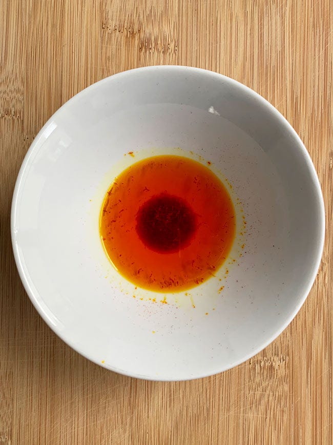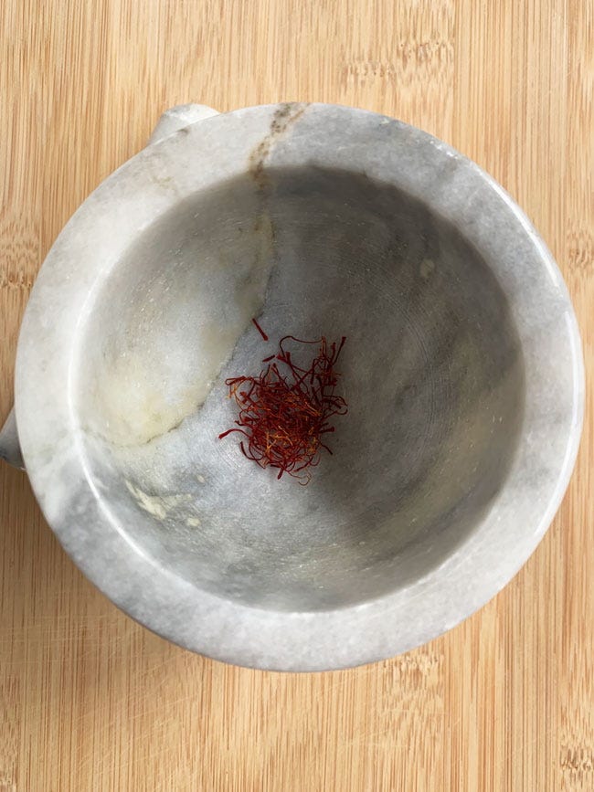 Similar to Wolfert, Shafia says: “Grind up the saffron in a mortar and pestle and let it steep in hot water, milk, butter or stock before using.”