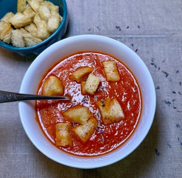 In this soup, lavender and saffron are both more of a whisp than a full-on flavor. There’s just enough so they can do their jobs boosting the soup’s complexity.